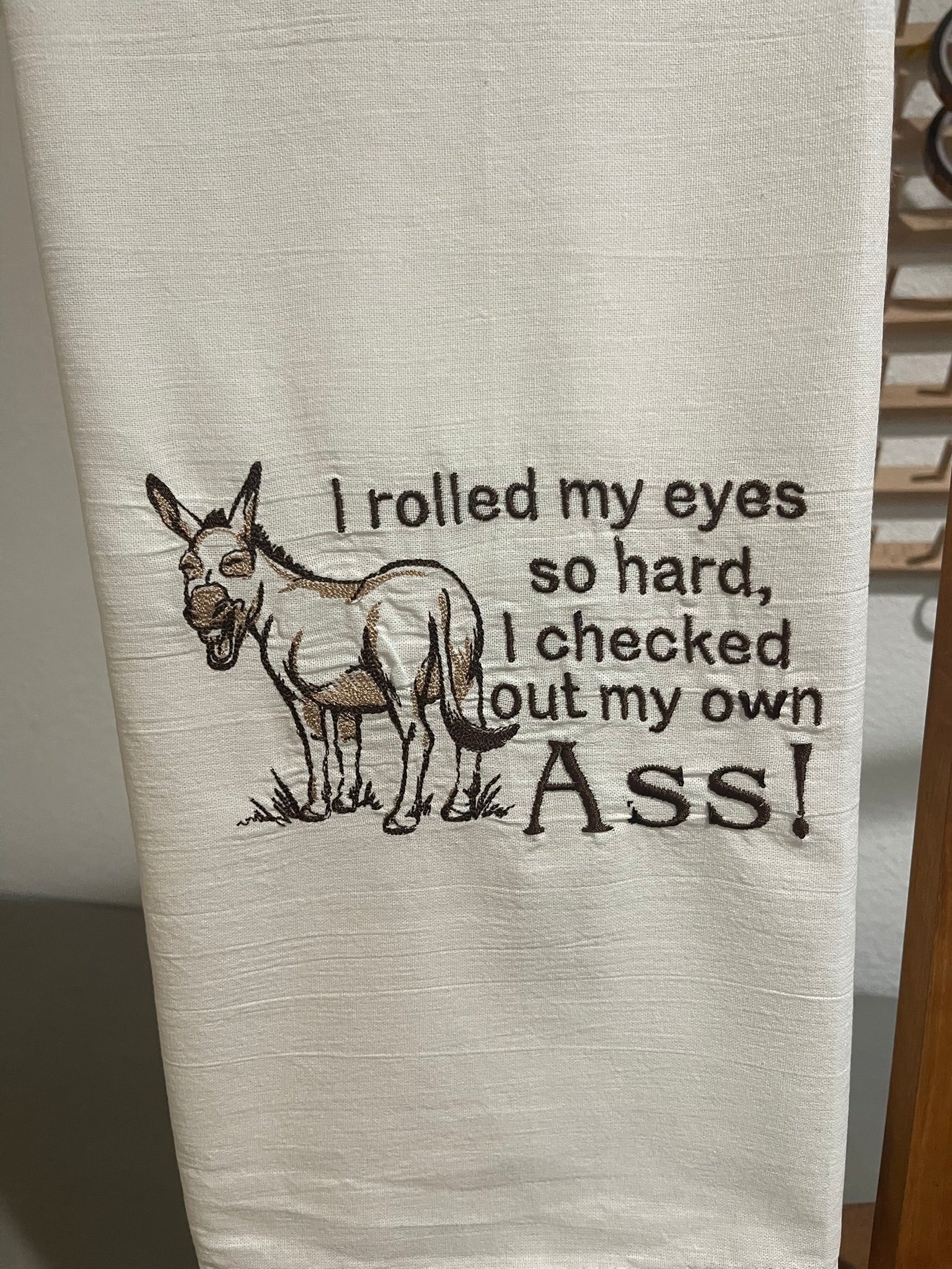 Add the Humor of "I Rolled my eyes so hard I checked out my own ass" embroidered towel to your kitchen.